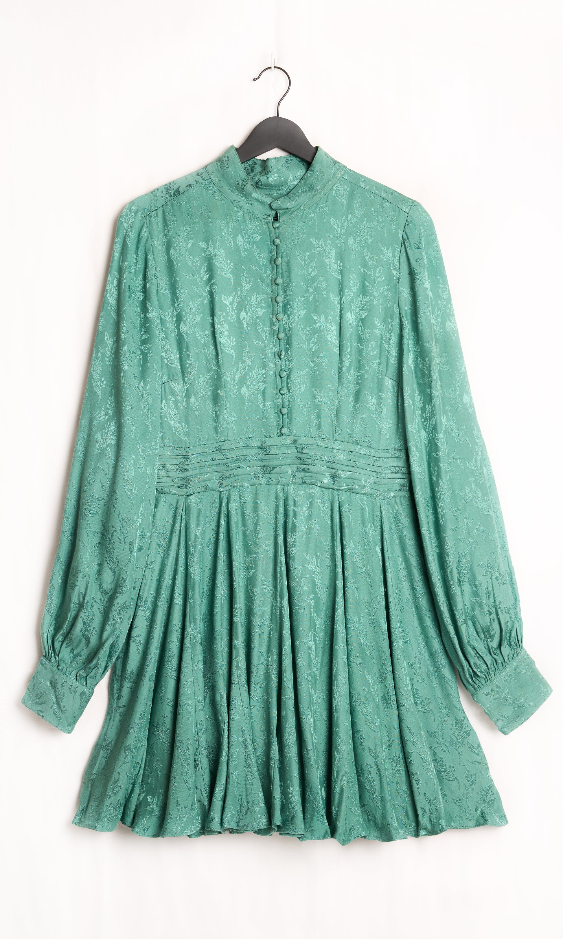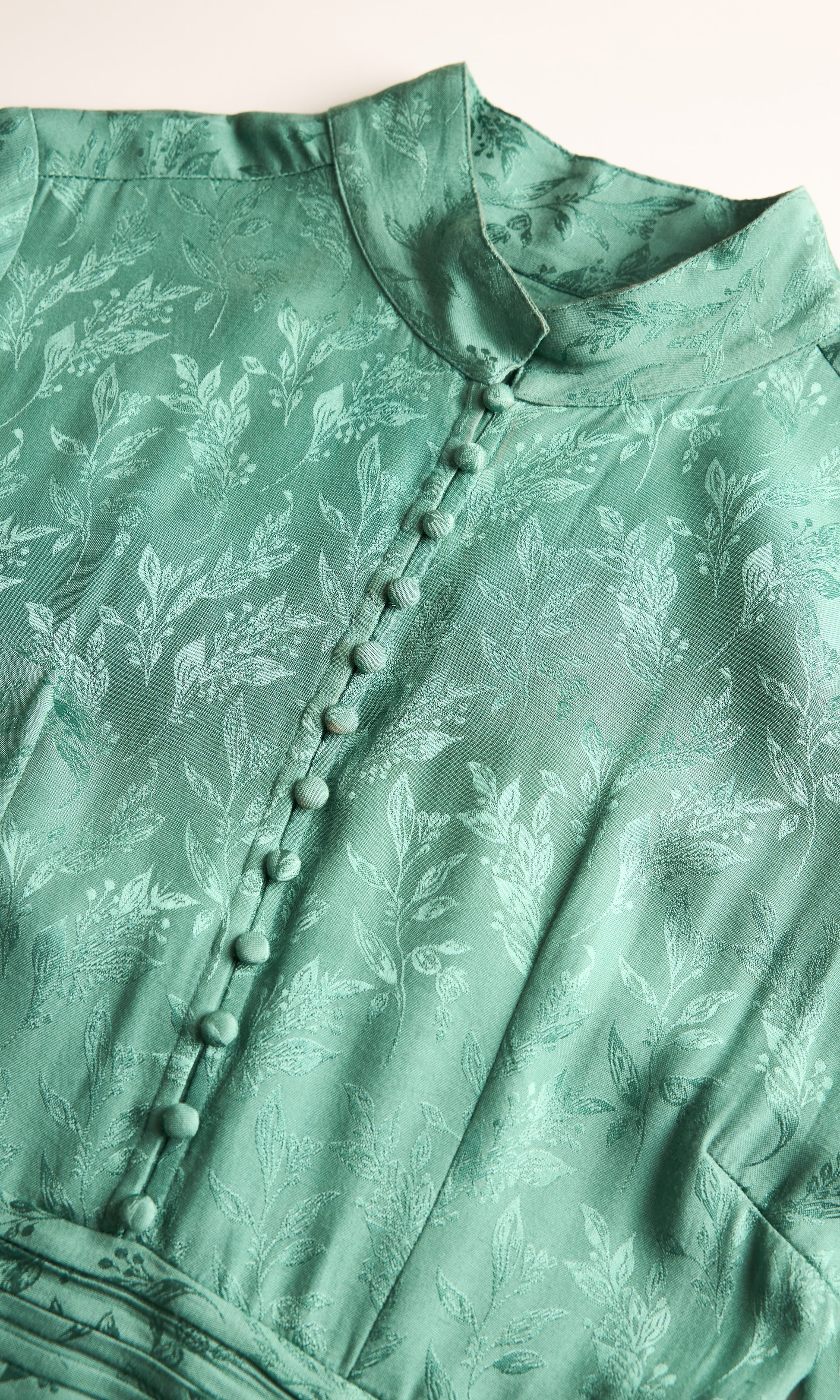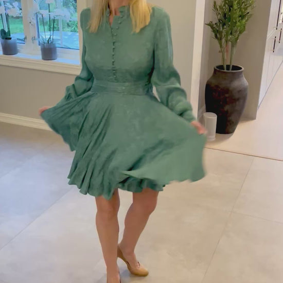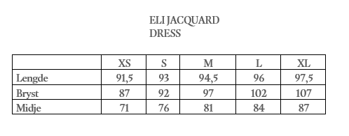Lekker kjole med jacquard-mønster i 100% myk viskose-sateng. Det innebygde beltet gir en flatterende fasong og volumet i skjørtet gir en feminin effekt. Kjolen er litt lengre bak, noe som gjør at den legger seg pent på kroppen. Det er stoff-trukkede knapper i front, som lar deg velge om du vil ha kjolen helt oppkneppet eller åpne opp til en v-hals. De samme stoff-trukkede knappene er også lagt til i ermet. Kjolen har glidelås i siden.
