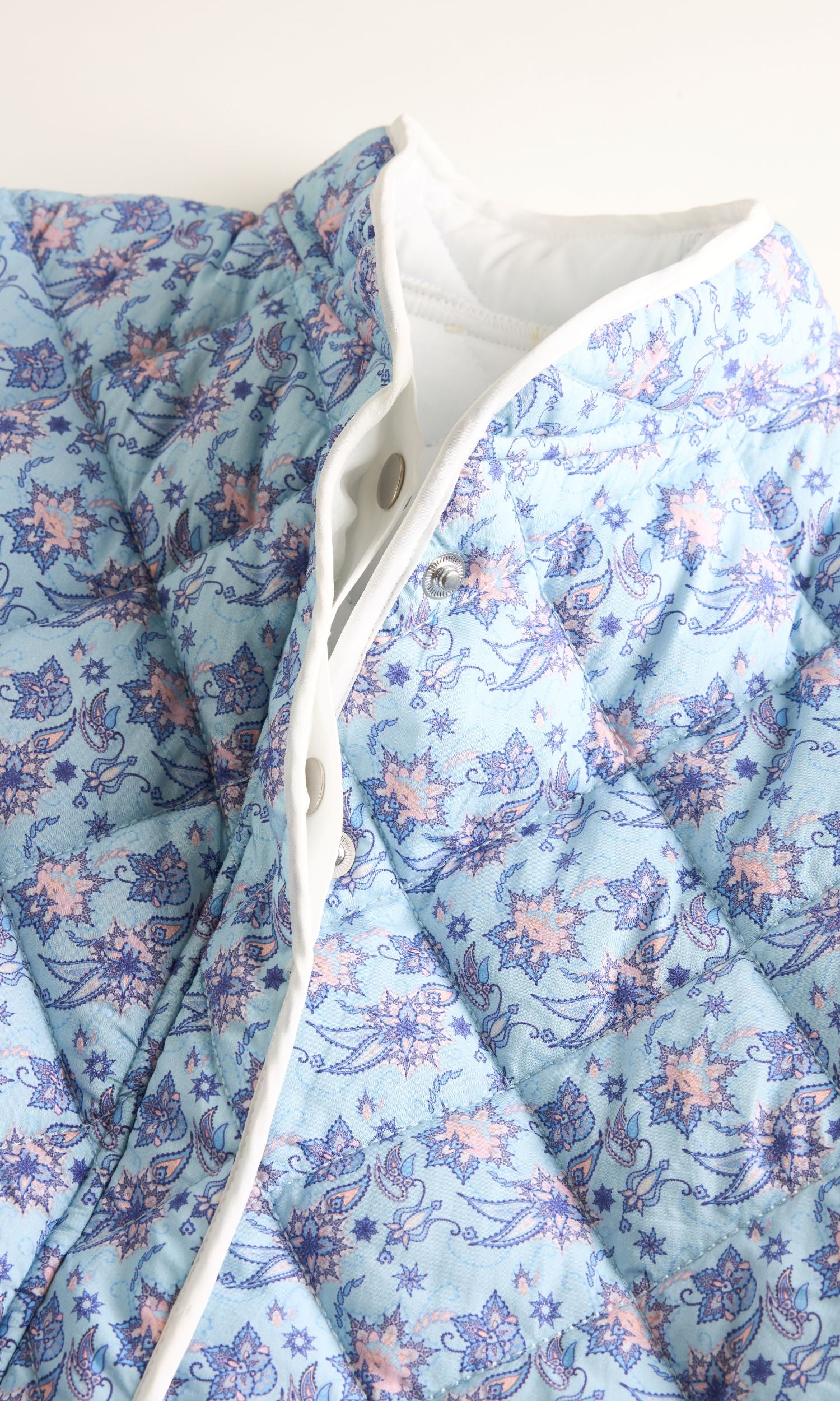 Quiltet og foret jakke i cotton poplin. Romslig passform med lekkert paisley-mønster. Jakken har dropshoulder og en klassisk kina-krage, med hvit piping langs kantene for et stilrent uttrykk. Skjulte trykknapper og romslige lommer med kontrastfarge gir både funksjon og stil.