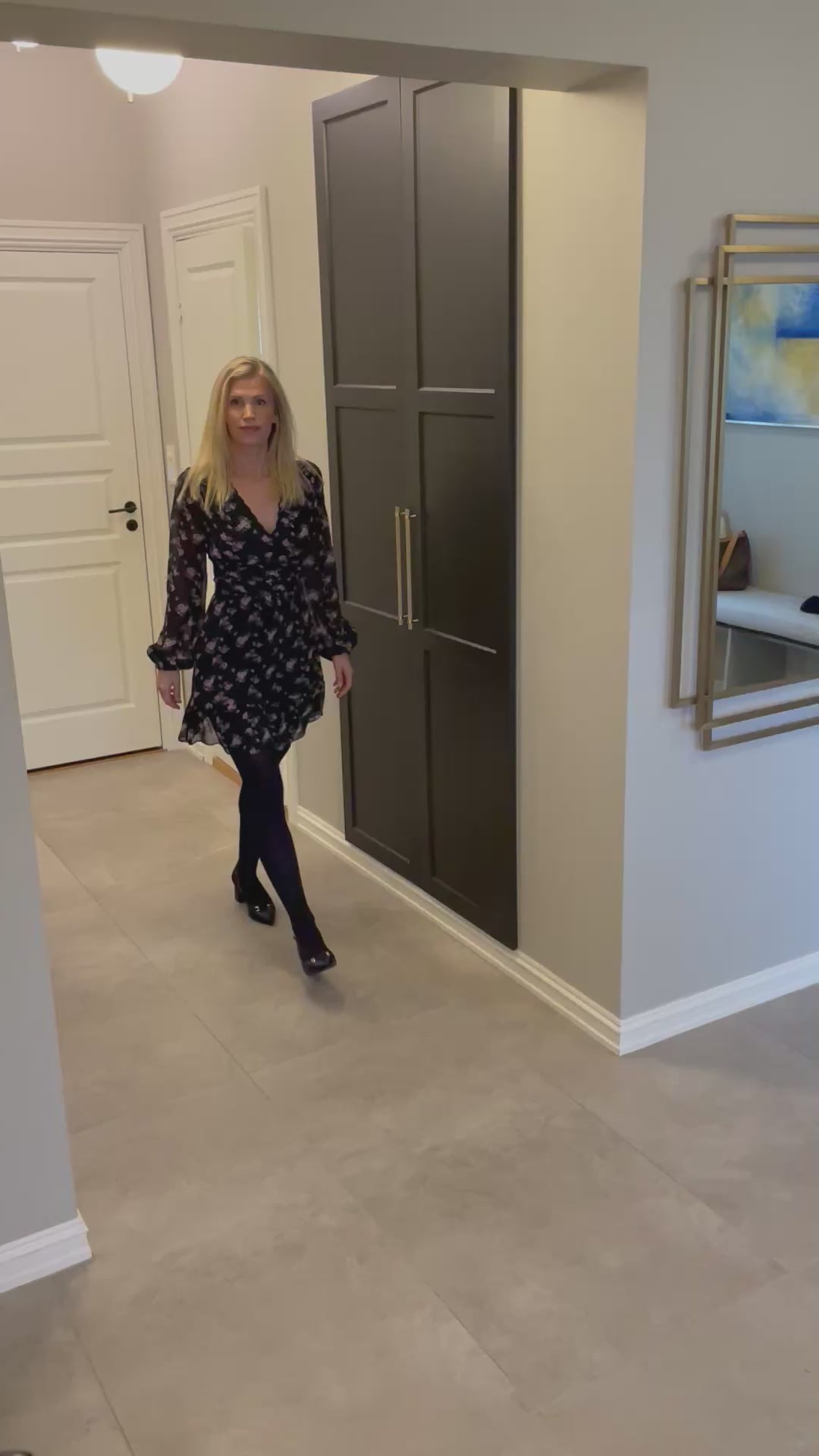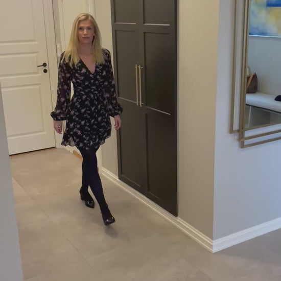 Silje dress er feminin og tidløs med delikate detaljer. V-hals med "scalloped edges" (buet kant), stoff-trukkede knapper og vide ermer med strikk nederst for behagelig passform. Kjolen er helfôret i kroppen og har lett transparente ermer.
